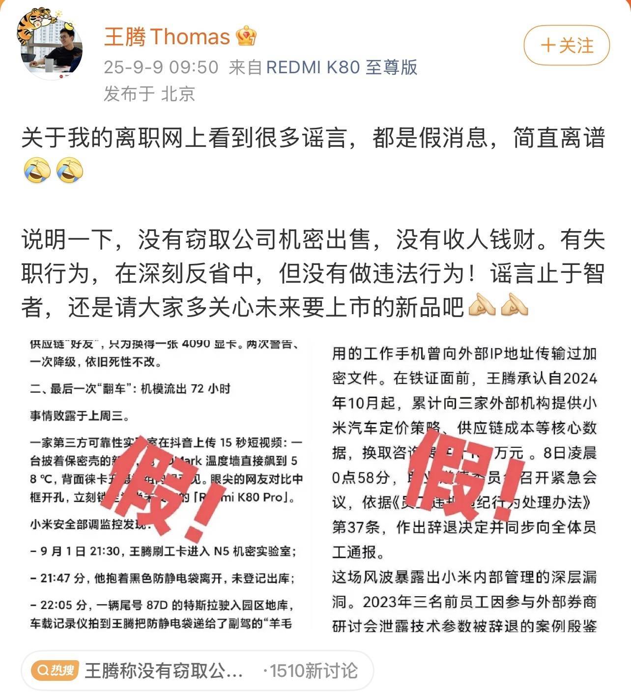 9月9日,小米前中国区市场部总经理兼前REDMI品牌总经理王腾在微博公开表态,称:“关于我的离职网上看到很多谣言,都是假消息,简直离谱。”