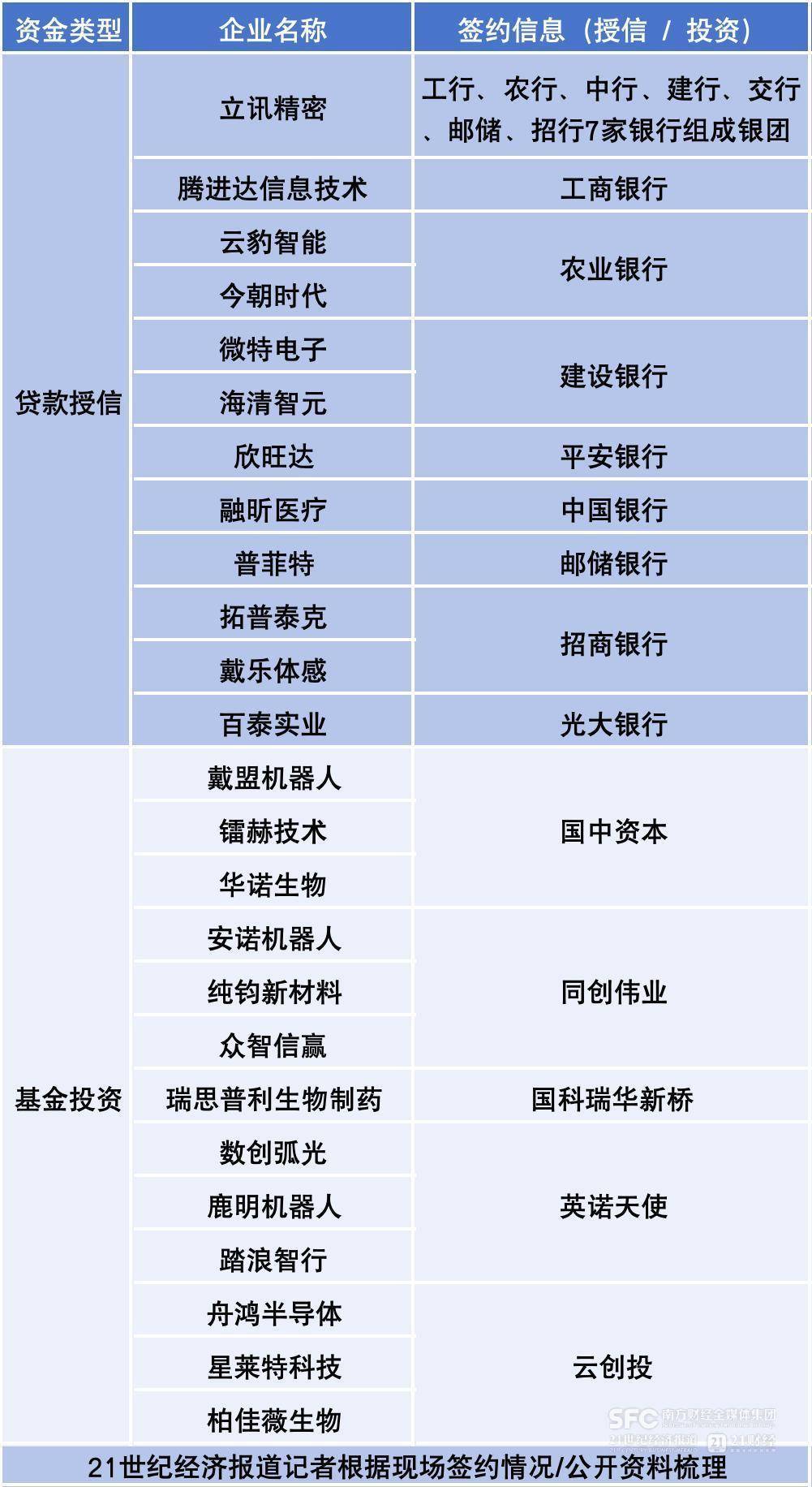 此外,现场贷款授信签约项目还包括:工商银行与腾进达信息技术;农业银行与云豹智能、今朝时代;建设银行与微特电子、海清智元;中国银行与融昕医疗;邮储银行与普菲特;招商银行与拓普泰克、戴乐体感;平安银行与欣旺达;光大银行与百泰实业。