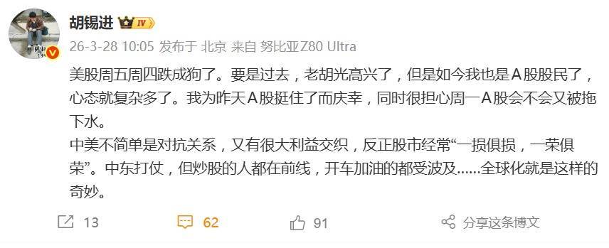 谈及中美两国市场的联动关系,胡锡进也给出了自己的判断。他表示,中美不简单是对抗关系,又有很大利益交织,“反正股市经常‘一损俱损,一荣俱荣’”。他表示,“中东打仗,但炒股的人都在前线,开车加油的都受波及…… 全球化就是这样的奇妙”。