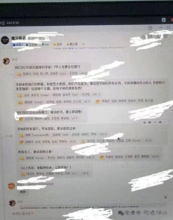 截图中追觅科技创始人、魔法原子实控人俞浩“下命令”要和宇树正面“争夺”。